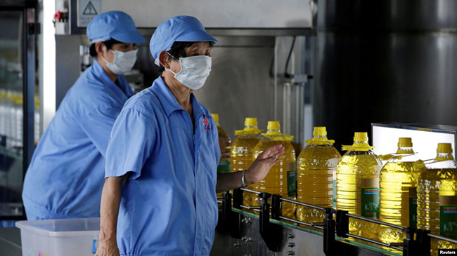 资料图片:2018年7月4日,中国一工厂工人用美国大豆提炼生产瓶装豆油。 在美中两国即将进行新一轮谈判之际,中国官方的新华社星期天(7月28)报道说,在美中两国元首在大阪会晤后,已有... |