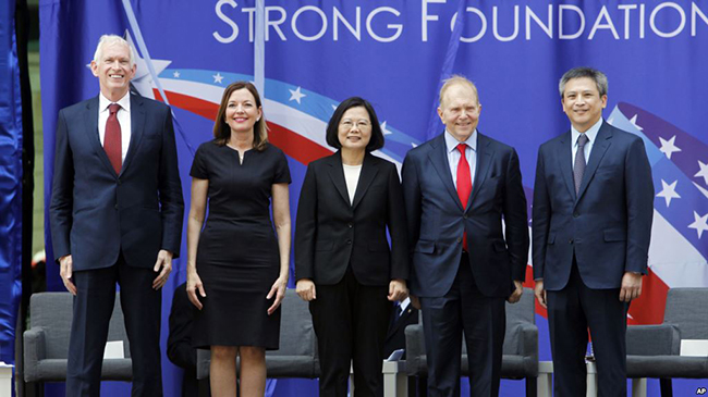 (从左至右)美国在台协会(AIT)主席莫健、美国国务院负责文教事务的助理国务卿玛丽·罗伊斯、台湾总统蔡英文、美国国务院负责海外建筑的首席副主任默色大使和美国在台协会主席台北办事处处长梅建华参加美国在台协会台... |