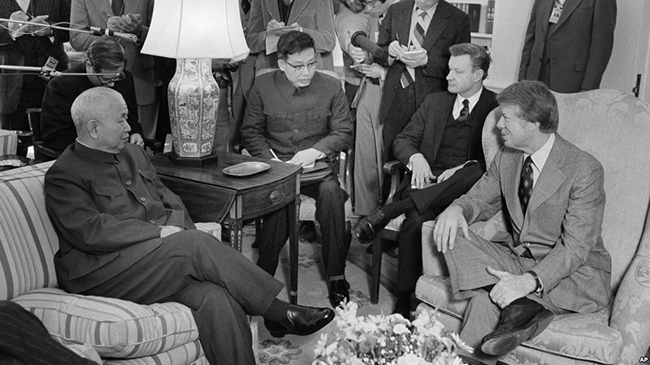1977年2月8日,美国总统卡特及其国家安全顾问布热津斯基在帮总统办公室会见中国驻美国联络处主任黄镇(前排左一) 从1979年美中两国正式建交至今,两国的关系走过了风风雨雨的四十年。虽... |