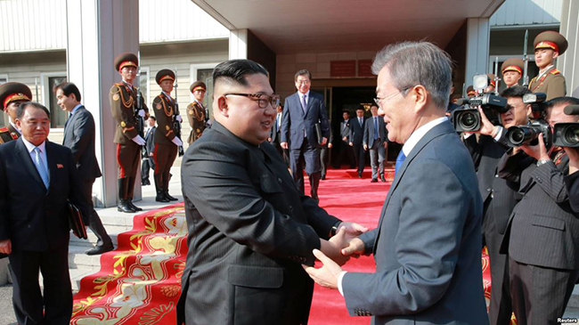 朝鲜官方通讯社朝中社2018年5月27日发布的韩国总统文在寅(右)与朝鲜领导人金正恩在两国边境板门店会晤时握手的照片。 朝鲜和韩国正在进行磋商,以促成朝鲜和美国之间签订一项互不侵犯... |