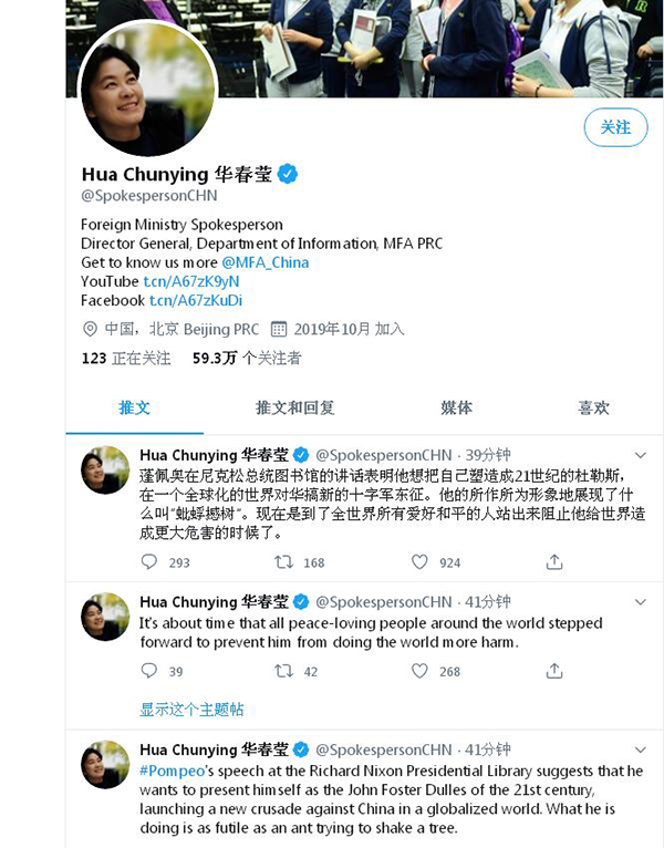 | 华春莹批蓬佩奥:21世纪杜勒斯,“蚍蜉撼树” | |