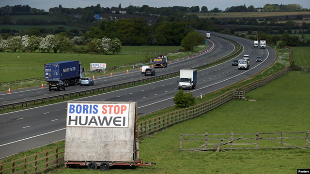 资料照片:英国公路旁一个敦促约翰逊首相禁用华为的标(2020年5月1日) 美国国务卿蓬佩奥星期二(7月14日)发表声明,欢迎英国计划禁止中国电信巨头华为公司参与未来5G网络。蓬佩奥说,越来越... |