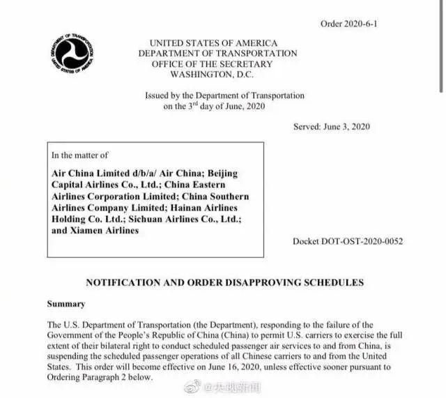 当地时间6月3日,美国交通部正式宣布,因中方没有允许美国航空公司提供往来中国的服务,美方将暂停允许中国航空公司提供来往于美国的航班,相关规定从当地时间6月16日开始执行,但仍有... |