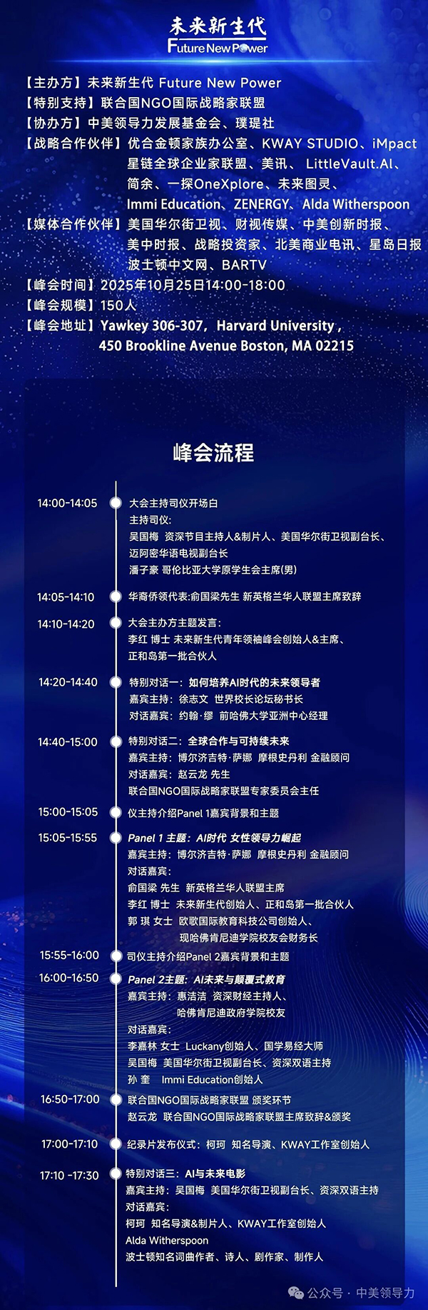 在全球化与人工智能浪潮重塑未来格局的时代,一场以“青年、领导力与未来”为核心议题的盛会——“2025未来新生代青年领袖峰会”,将于10月25日下午在哈佛大学隆重举办。 ... |
