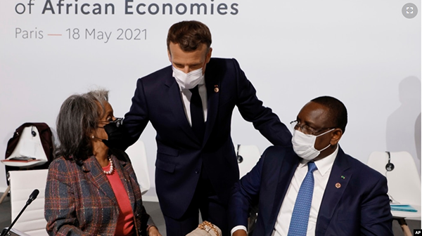 资料照:2021年5月18日,在巴黎举行的非洲经济体融资峰会上,法国总统马克龙(中)向埃塞俄比亚总统萨赫勒-沃克·祖德(左)和塞内加尔总统麦基·萨勒致敬。 在布鲁塞尔举行的为期两天的峰会... |