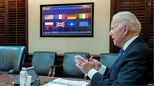 2022年1月24日,美国总统拜登在白宫与欧洲领导人讨论俄罗斯和乌克兰局势。(照片由白宫提供给路透社)。 自俄罗斯开始在乌克兰边境集结军队以来的几个月里,拜登政府多次警告说,莫斯科... |