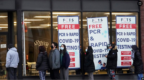 资料照片:人们在芝加哥的一处免费检测站点排队等候接受新冠病毒检测。(2021年12月20日) 白宫星期二(1月18日)推出了美国公民免费订购COVID-19居家检测试剂盒的网站,比原计划提前了一天... |
