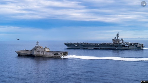 美国海军公布的照片显示,一架F-35C战斗机从“卡尔文森”号航空母舰飞行甲板上起飞,这艘航母与“塔尔萨”号濒海战斗舰正在驶过南中国海。(2021年9月7日) 美国国防部星期一(2021年11月... |