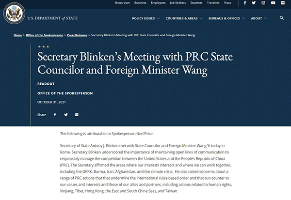 美国国务卿布林肯同中国国务委员兼外长王毅周日(10月31日)在意大利罗马举行了会晤。美国国务院官网截图 据美国国务院网站,布林肯在会谈中强调保持开放的... |