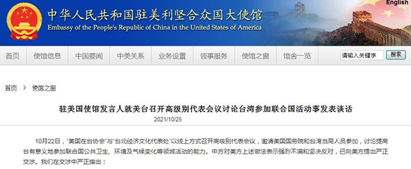 10月25日,中国驻美国使馆发言人就美台召开高级别代表会议讨论台湾参加联合国活动一事表示强烈不满和坚决反对,已向美方提出严正交涉。 中方在交涉中严正指... |