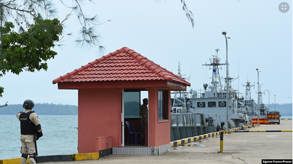资料照片:在政府组织的媒体参观期间,柬埔寨海军人员在西哈努克省的云朗海军基地守卫一个码头。(2019 年7月26 日) 美国研究机构战略与国际研究中心(CSIS)公布的对柬埔寨云朗海军基地... |