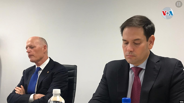 资料照:2019年11月12日,代表佛罗里达州的两位共和党籍联邦参议员鲁比奥(右)与斯科特(左)在该州的一个论坛上。 三名共和党籍的联邦参议员星期四(10月14日)呼吁拜登政府把中国电... |