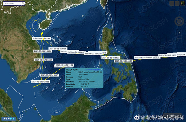 “南海战略态势感知”10月10日在微博发布图片称,美海军测量船正在南海大范围作业。南海战略态势感知发布的图片显示,美海军测量船在南海大范围作业。(图片来源:南海战略态势感知微博... |