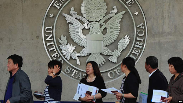 资料照:美国驻北京大使馆前排队申请赴美签证的人。 在上了一个学期的网课之后,中国学生王子威期待着与返校的同学在美国圣路易斯华盛顿大学的校园见面。但是这位23岁的金融专业学生却意... |