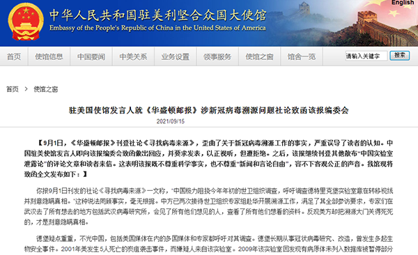 中国驻美大使馆9月14日公开一份致美国《华盛顿邮报》函件,对该报涉新冠病毒溯源问题“罔顾事实、毫无根据”的说法予以批驳。 9月1日,《华盛顿邮报》刊登... |