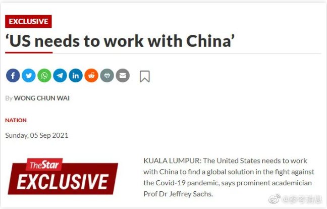 9月5日,国际医学期刊《柳叶刀》杂志新冠委员会主席、美国经济学家杰弗里·萨克斯在接受马来西亚《星报》独家专访时表示,“美国需要与中国合作,以找到抗击新冠大流行的全球解决方案。... |