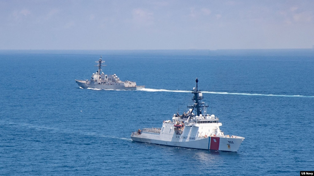 美国海军公布的图片显示美国海军“基德”号阿利·伯克级导弹驱逐舰与美国海岸警卫队“蒙罗”号传奇级巡逻舰在当地时间2021年8月27日例行穿越台湾海峡的国际水域。 一艘美国海军驱逐舰和... |