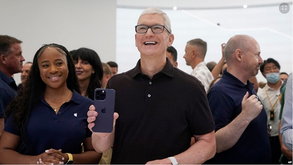 苹果公司首席执行官蒂姆·库克2022年9月7日在加州库比蒂诺举行的发布会上举起一款新的iPhone 14手机。就在美国政府对中国采取一系列更严厉的投资和技术出口管制之际,批评人士说,苹果公司与中国芯片制造商长江存储... |
