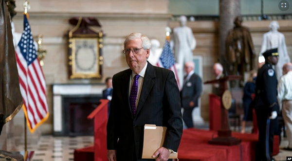 参议院少数党领袖麦康奈尔前往参议院议事大厅。参议院将就一项为半导体产业提供2800亿美元资金支持的法案进行最终投票。(2022年7月27日) 美国国会参议院星期三(7月27日)以64比33的表决... |