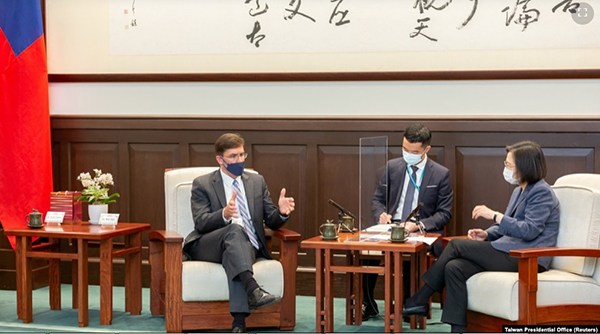 台湾总统蔡英文在台北会见到访的美国前防长埃斯珀。(2022年7月19日) 美国前国防部长马克∙埃斯珀(Mark Esper)在台北表示,由于美国“一中”政策现在已经没有用了,因此美国应该放弃... |