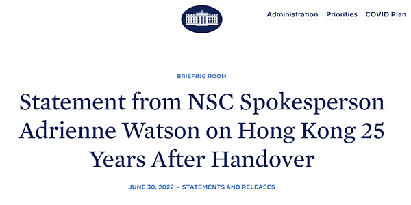 周四,白宫国安会就香港主权移交25周年发表声明,批评当前香港局势。 以国安会发言人Adrienne Watson名义发布的声明称,今年的纪念日本该是“中英联合声明... |