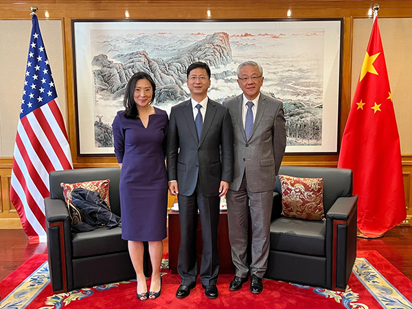 2022年6月14日,驻旧金山总领事张建敏在总领馆会见美国乒乓球协会首席执行官沈伟妮和美中公共事务协会会长滕绍骏。 沈伟妮介绍了美国乒协与中国乒协交流合... |