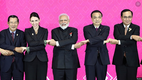 印度总理莫迪(中)在泰国曼谷召开的第三届区域全面经济伙伴合作峰会上与其他与会国领导人合影。(2019年11月4日) 2022年1月1日,包括中国在内的十五个亚太地区国家达成的区域全面经济... |