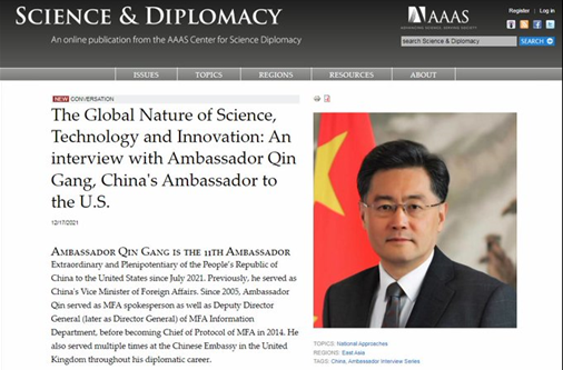 2021年12月17日,秦刚大使接受了《科学与外交》杂志的执行主编、国际事务与科学外交部主任KimMontgomery有关中国的科学外交行动的采访。采访全文如下: Kim Montgomery:自1979年中... |