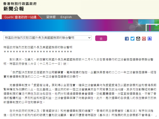 香港特区政府新闻网站刚刚发布新闻公报,对于澳大利亚、加拿大、新西兰和英国外长及美国国务卿就12月19日在香港举行的立法会换届选举发表联合声明,特区政府发言人今日(21日)表示,坚... |