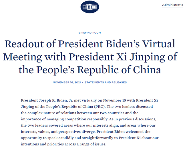 美国总统拜登在华盛顿时间2021年11月15日与中国国家主席习近平以视讯方式举行峰会(路透社) 美国总统拜登与中国国家主席习近平以视讯方式进行了首次面对面会谈。中方将这次会谈描述为“... |