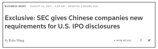 路透社8月24日独家报道称,美国证券交易委员会(SEC)已开始向寻求赴美上市的中国企业提出新的披露要求,其中包括披露更多所谓“中国监管者干预企业数据安全政策”的风险,以提高投资者... |