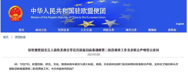 据中国驻欧盟使团网站消息,驻欧盟使团发言人就欧美澳日等官员就新冠病毒溯源第二阶段调查工作发表联合声明答记者问,内容如下。 问:7月27日,欧盟创新、... |