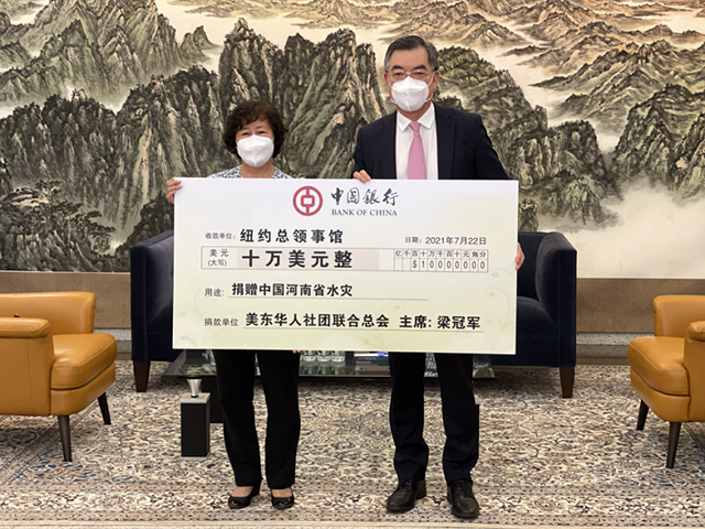近日,中国河南遭遇历史罕见特大暴雨,多地发生严重洪涝灾害。严峻的防汛形势牵动着海内外中华儿女的心,7月22日,中国驻纽约总领事黄屏在总领馆接受美东华人社团联合总会共同主席梁冠军向受灾地区捐赠的10万美... |