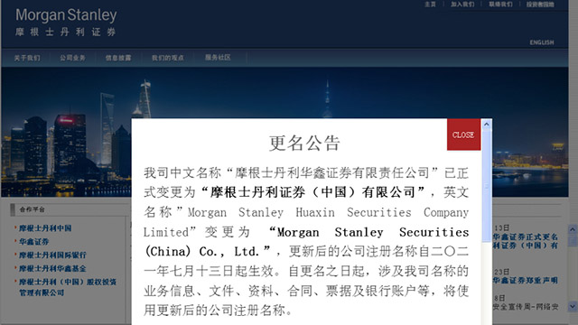 摩根士丹利证券(中国)有限公司官网发布的更名公告。 20年前,中国入世允许外资设立合资证券公司;去年4月,中国正式取消证券公司的外资股比限制,证券市场数十年间的逐步开放让更多外... |