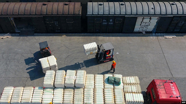 资料照片:中国江西省九江火车站的一名工人正在装卸从新疆运来的棉花。(2021年3月26日) 美国参议院星期三(7月14日)通过了禁止进口来自中国新疆的产品的《防止强迫维吾尔人劳动法》(The... |
