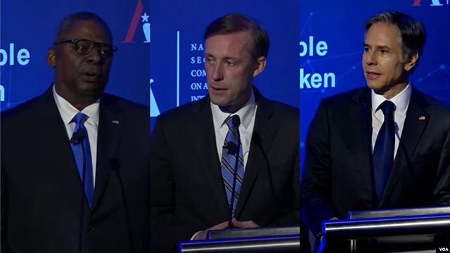美国国防部长奥斯汀(左)、国家安全部问沙利文(中)和美国国务卿布林肯(右)2021年7月13日在华盛顿出席全球技术峰会 十多个民主国家和国际组织领导人星期二(7月13日)在一场由美国政... |