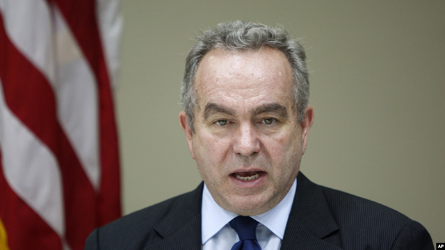 资料照片:时任美国东亚和太平洋事务助理国务卿的坎贝尔在美国驻吉隆坡大使馆的一次记者会上讲话。(2012年12月13日) 白宫印-太事务协调员坎贝尔星期二(7月6日)说,中国与美国是有可能和... |