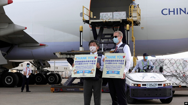 台湾疾病管制署公布的照片显示台湾卫生部长陈时中与美国在台协会驻台北办事处处长郦英杰举着感谢标语牌欢迎运载新冠疫苗的华航飞机抵达台北。 (2021年6月20日) 在美国和台湾本星期即将举... |