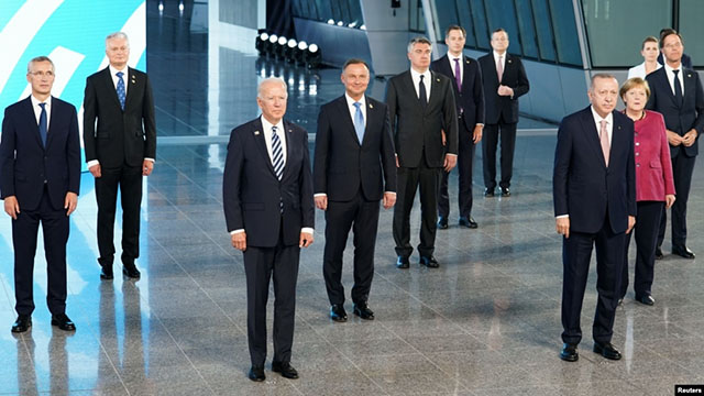 美国总统拜登和其他北约成员国领导人在布鲁塞尔出席北约峰会时合影。(2021年6月14日) 北大西洋公约组织三十个成员国在星期一(6月14日)峰会结束后发表联合公报说,中国对基于规则的国... |