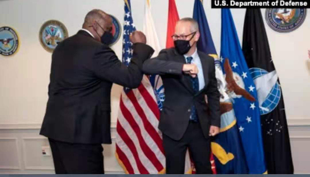 美国国防部负责政策的次长科林·卡尔博士(Dr. Colin Kahl)(右)2021年4月28日宣誓就职后与防长奥斯汀碰胳膊(美国国防部照片) 美国主管国防政策的一位高级官员说,正确应对中国的挑战... |