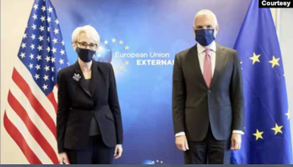 美国副国务卿谢尔曼(Wendy Sherman)(左)2021年5月26日与欧盟对外行动署秘书长萨尼诺(Stefano Sannino)会晤(照片来自美国副国务卿谢尔曼的推特网页) 美国拜登政府和欧盟举行了首次中... |