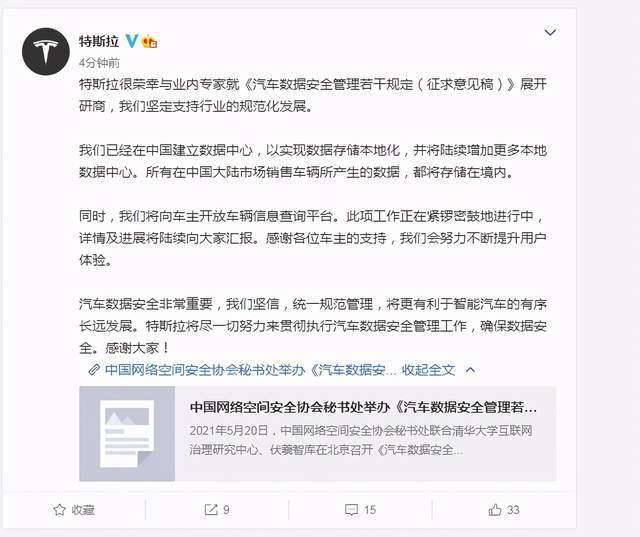 据@特斯拉 5月25日晚消息,特斯拉很荣幸与业内专家就《汽车数据安全管理若干规定(征求意见稿)》展开研商,我们坚定支持行业的规范化发展。 我们已经在中... |