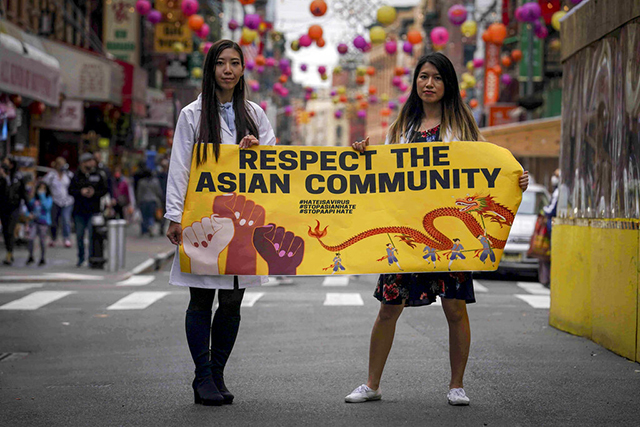 由于疫情和反亚裔事件的激增,一些华裔小企业主遭受了沉重的双重打击并深感恐惧,不过社区内的支持和团结带来了一线希望。4月24日在纽约唐人街,两名华裔展示抗议反亚裔仇恨的横幅。(... |