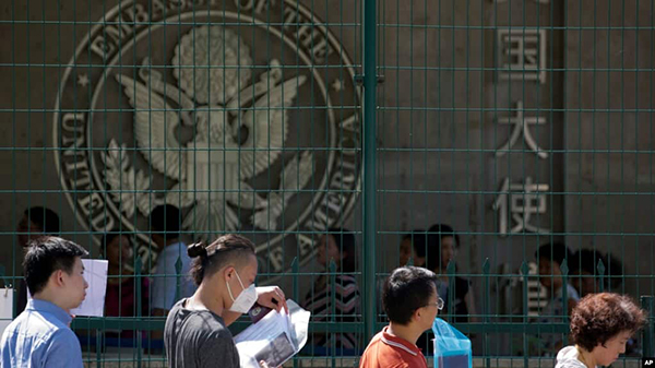 资料照片:等待进入美国驻北京大使馆的签证申请者。(2018年7月26日) 拜登政府周二(4月27日)表示,将在今年秋天放松对中国和其他国际学生进入美国的旅行限制。这一改变可能会为一些在冠状... |