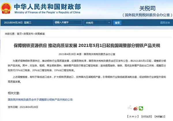 财政部网站截图 据财政部网站消息,为更好保障钢铁资源供应,推动钢铁行业高质量发展,经国务院批准,国务院关税税则委员会近日发布公告,自2021年5月1日起,调整部分钢铁产品关税。 ... |