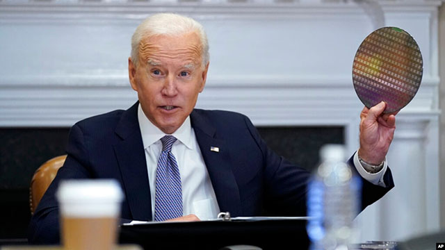 拜登总统在白宫罗斯福厅举行有关半导体和供应品韧性CEO视频峰会期间手举一块晶圆。(2021年4月12日) 美国总统乔·拜登(Joe Biden)把他的2万亿美元基础设施开支方案与缓解严重的半导体短缺... |