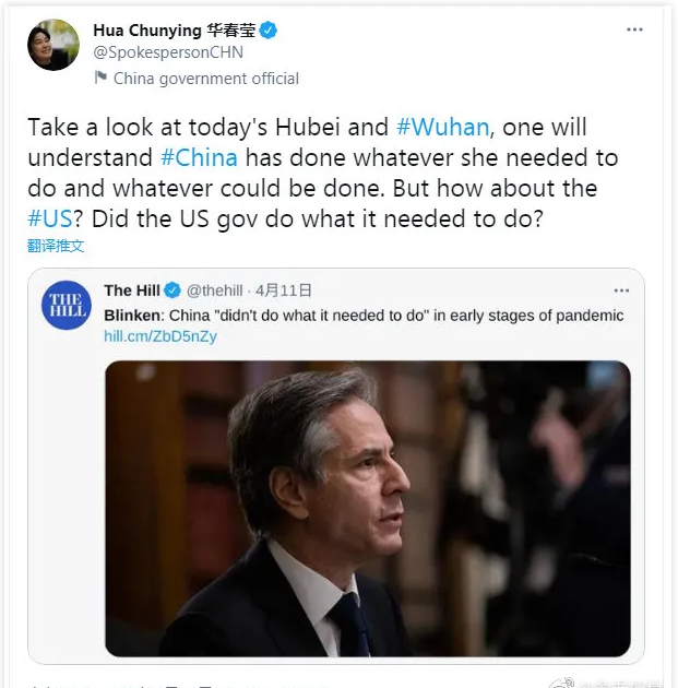 4月13日,外交部发言人华春莹在推特上发文反问布林肯:“看看今天的湖北和武汉,你就会明白中国已经做了需要做的和能做的一切。但美国呢?美国政府做了该做的事吗?” ... |