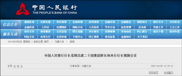 中国人民银行网站4月8日消息,北京时间2021年4月7日晚,二十国集团(G20)主席国意大利主持召开G20财长与央行行长视频会议,讨论全球经济形势、《G20应对新冠肺炎疫情行动计划》更新、... |