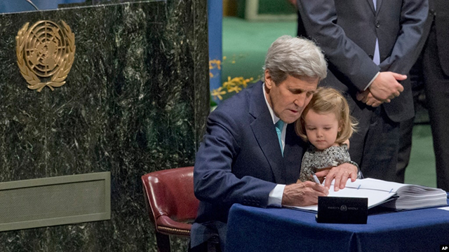 2016年4月22日,时任美国国务卿克里怀抱其孙女在联合国总部签署《巴黎气候变化协议》。(美联社照片) 美国总统拜登的气候变化特使克里参加联合国框架下的气候行动部长级会议,标志着华... |