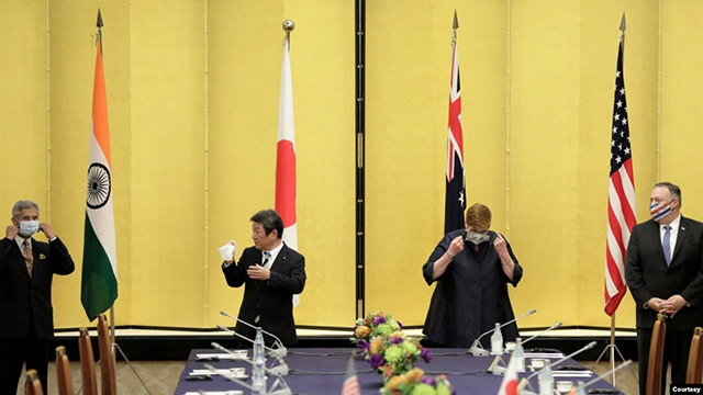 美日澳印外长2020年10月6日在东京会晤(媒体联访照片) 美国国务卿布林肯计划星期四(2021年2月18日)一大早与日本、澳大利亚和印度外长举行视讯会议,显示在拜登新政府任内美国计划沿用... |